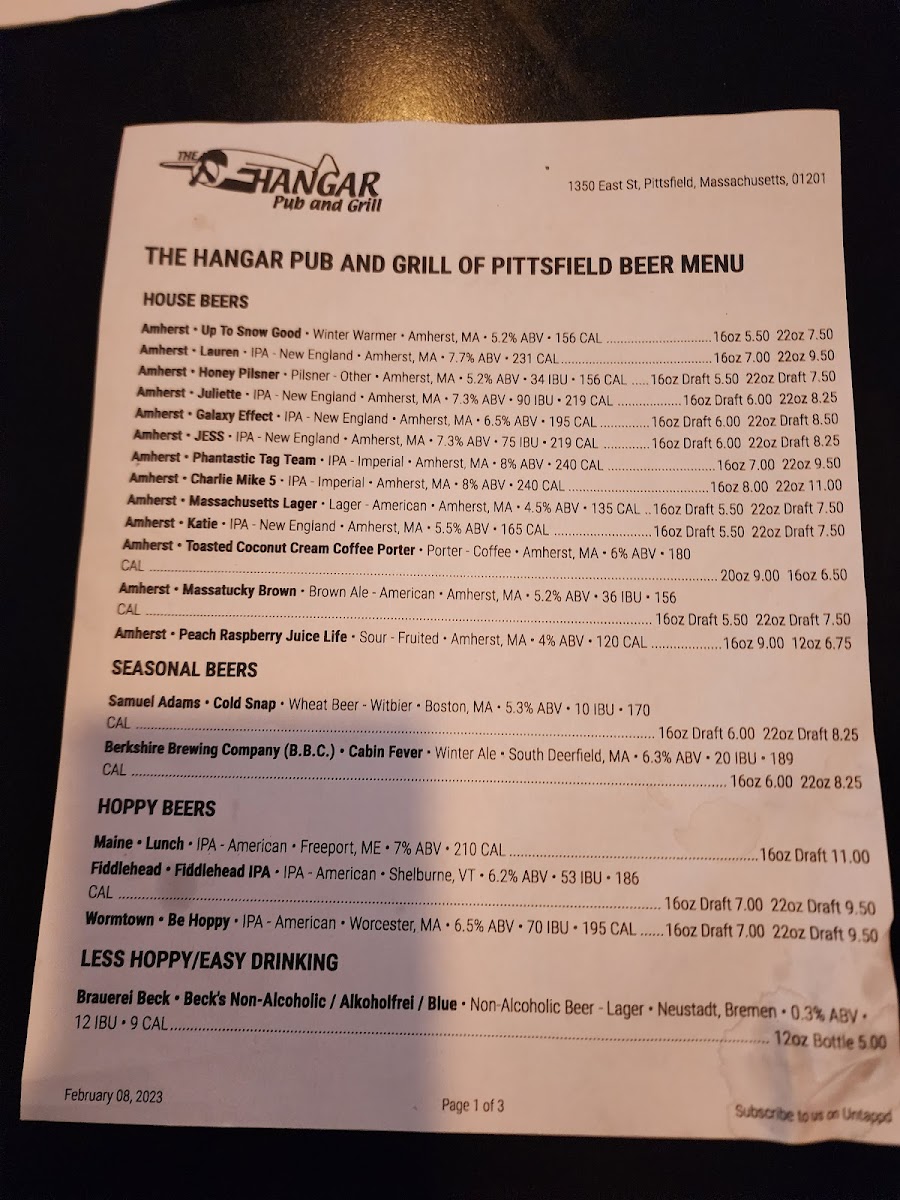 Hangar Pub and Grill of Pittsfield Menu (2025 Update)